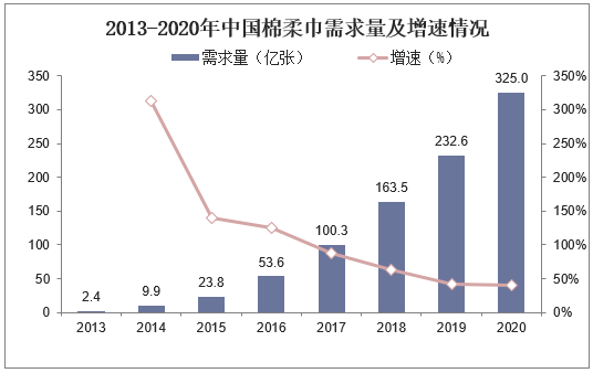 基于产品属性、生产效率、环保等优势,婴儿、产妇、敏感肌肤者和美妆护肤频率高的人群更愿意为高质量付出高价格,因此棉柔巾产品认知度迅速提升,市场需求量快速增长。据统计,2020年中国棉柔巾市场需求量为325亿张,同比上涨39.72%,年均复合增长速度为101.62%,还处于高速增长阶段。